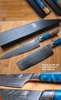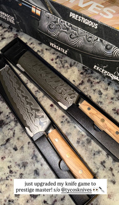 We were a little bit skeptical about buying these knives because the price was so low. But to our surprise, the balance, look and durability are absolutely amazing. We now use them not only for prep and onsite events. They've become our go to for our weekly cooking show on KOLO (ABC) Morning Break every Tuesday. Would 100% recommend!